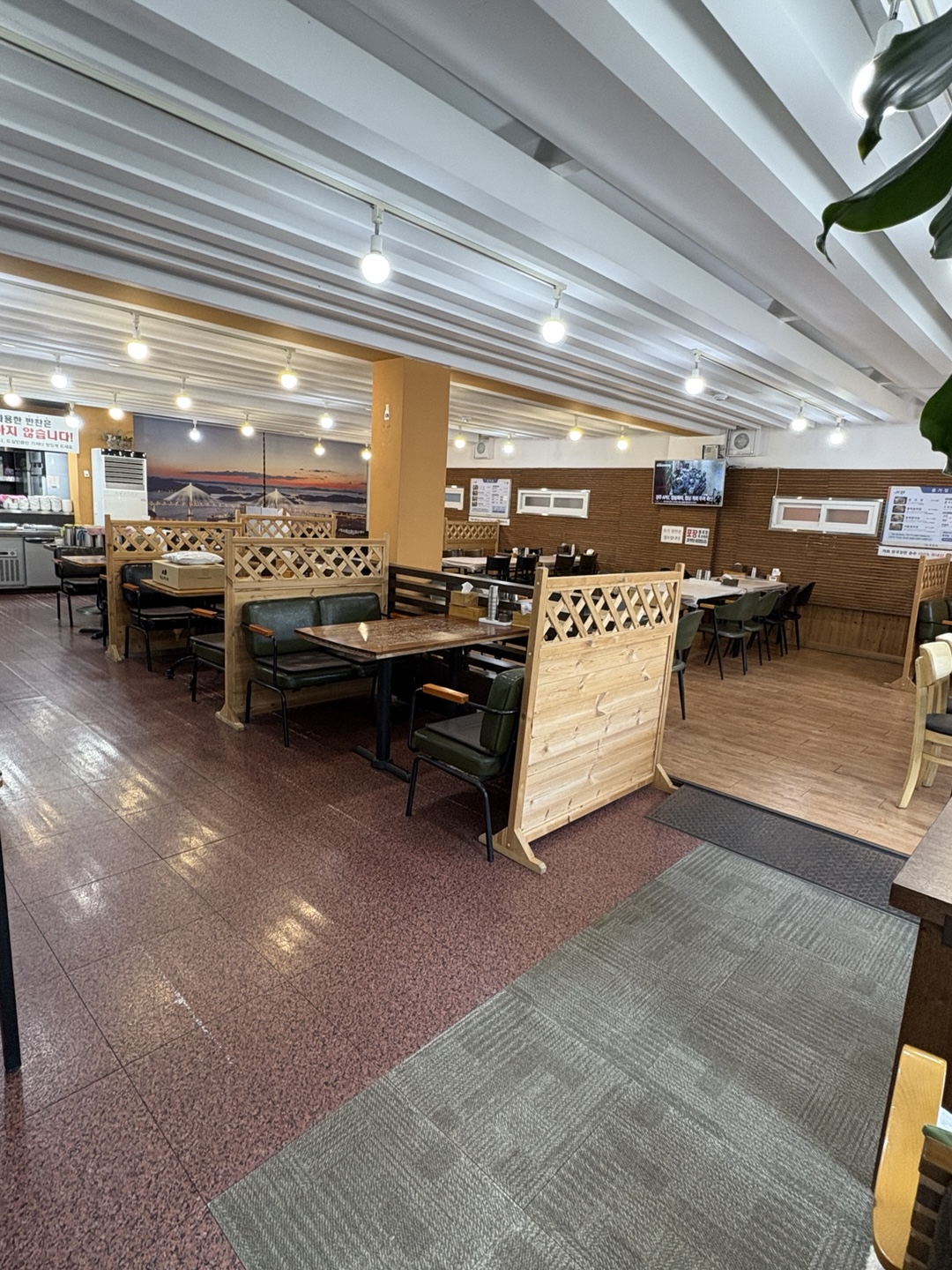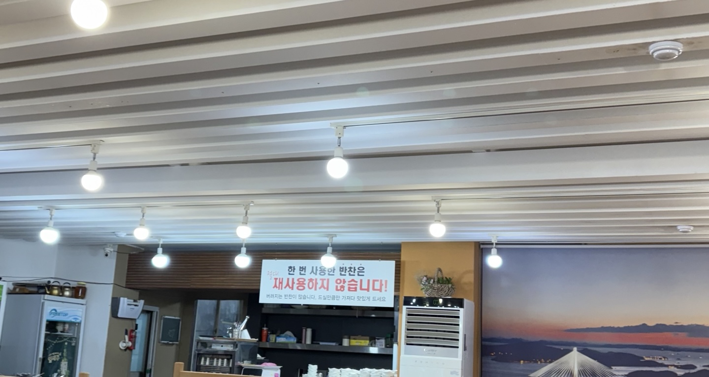 가게 곳곳이 전체적으로 깔끔합니다. 한 번 사용한 반찬은 재사용하지 않는다는 문구..