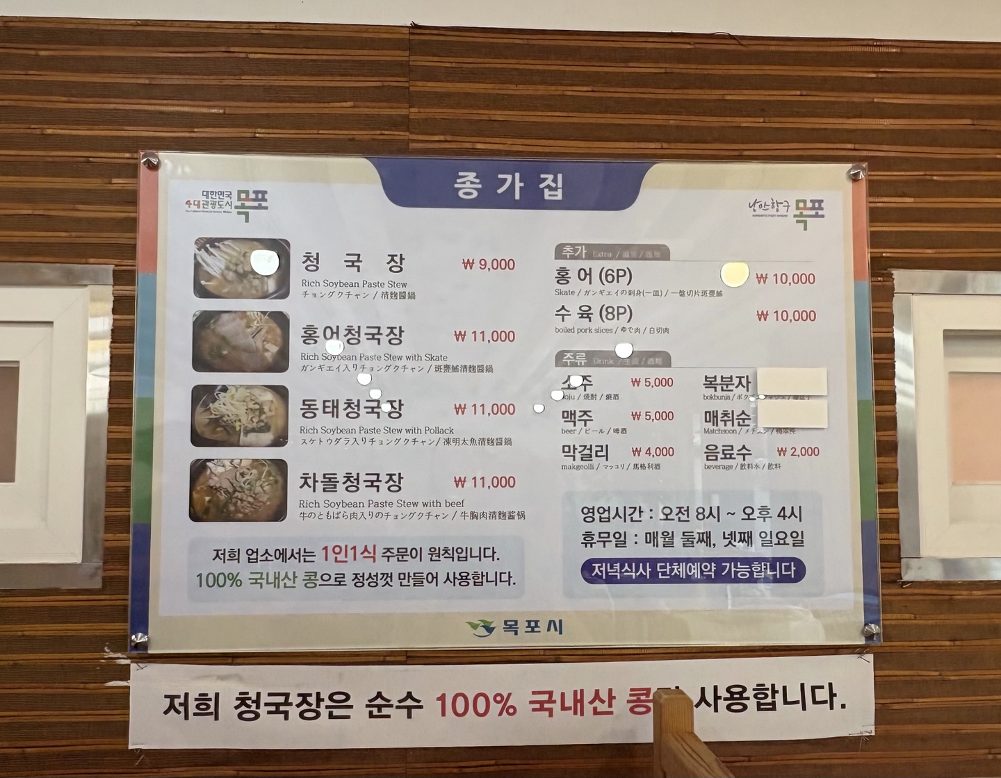 목포 청국장 맛집 전문점 종가집 메뉴
