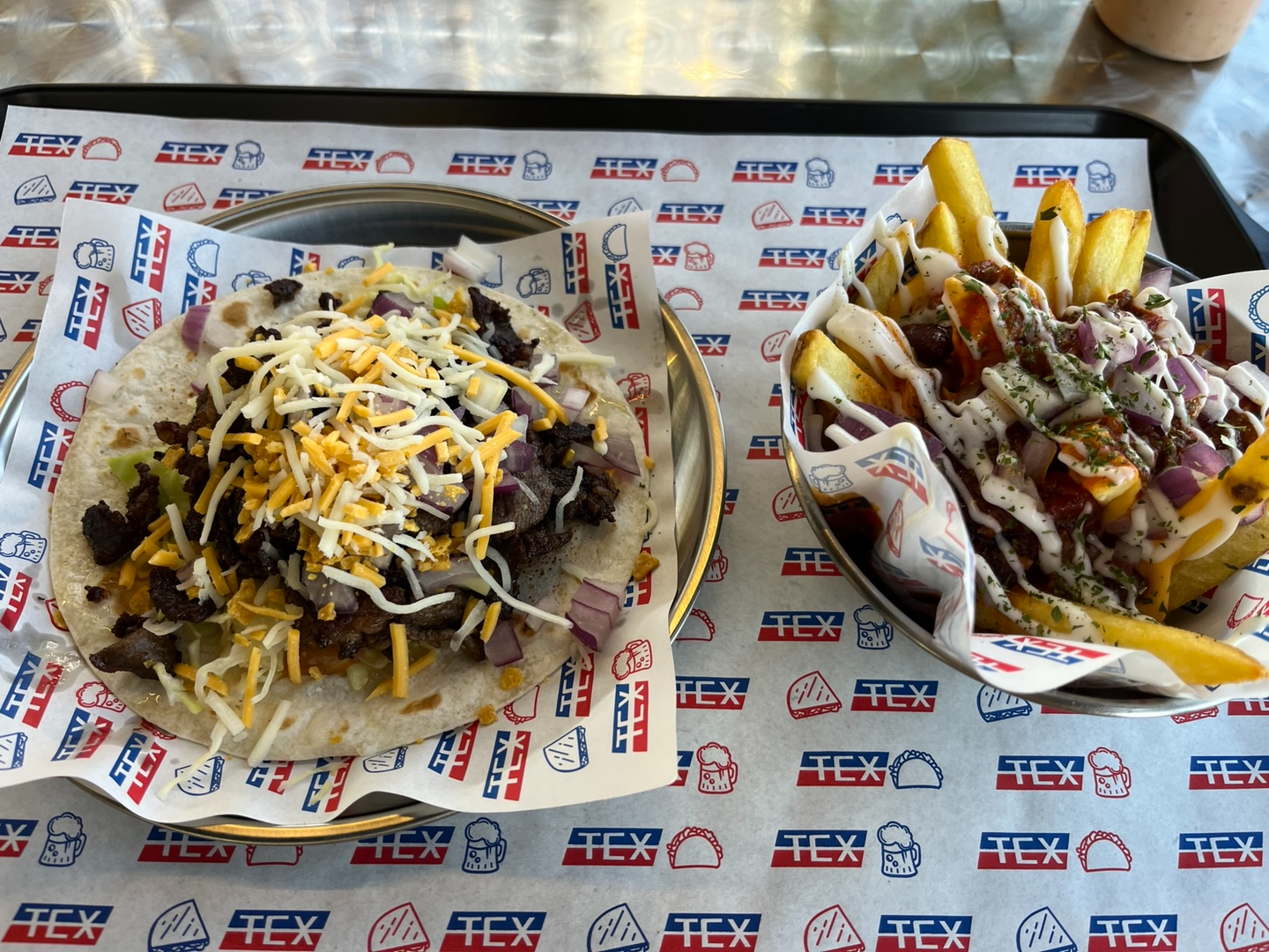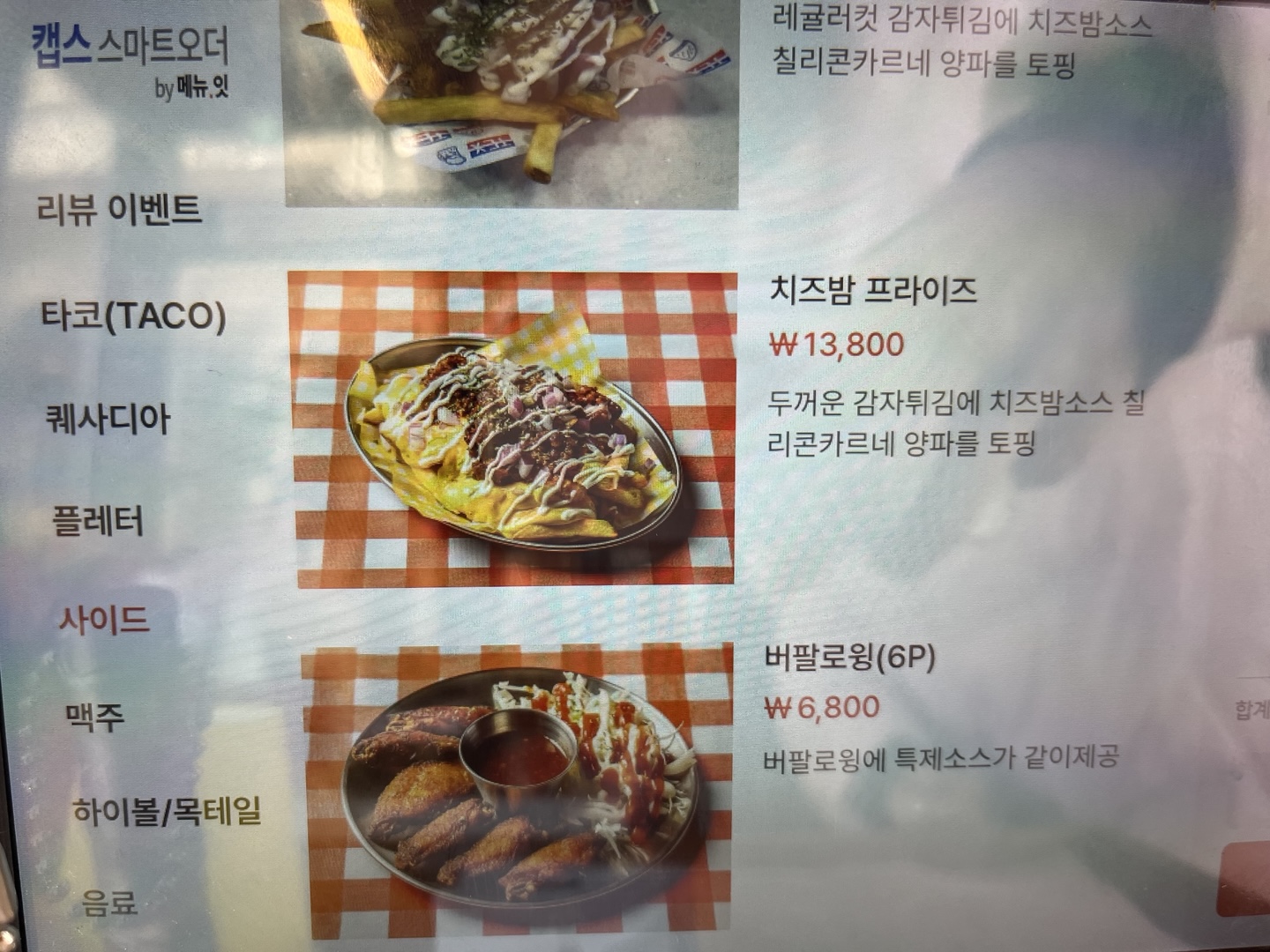 혼자올 때는 사이드 메뉴에 있는 치즈밤 프라이즈 하프 사이즈를 비프 타코에 곁들여 먹습니다.